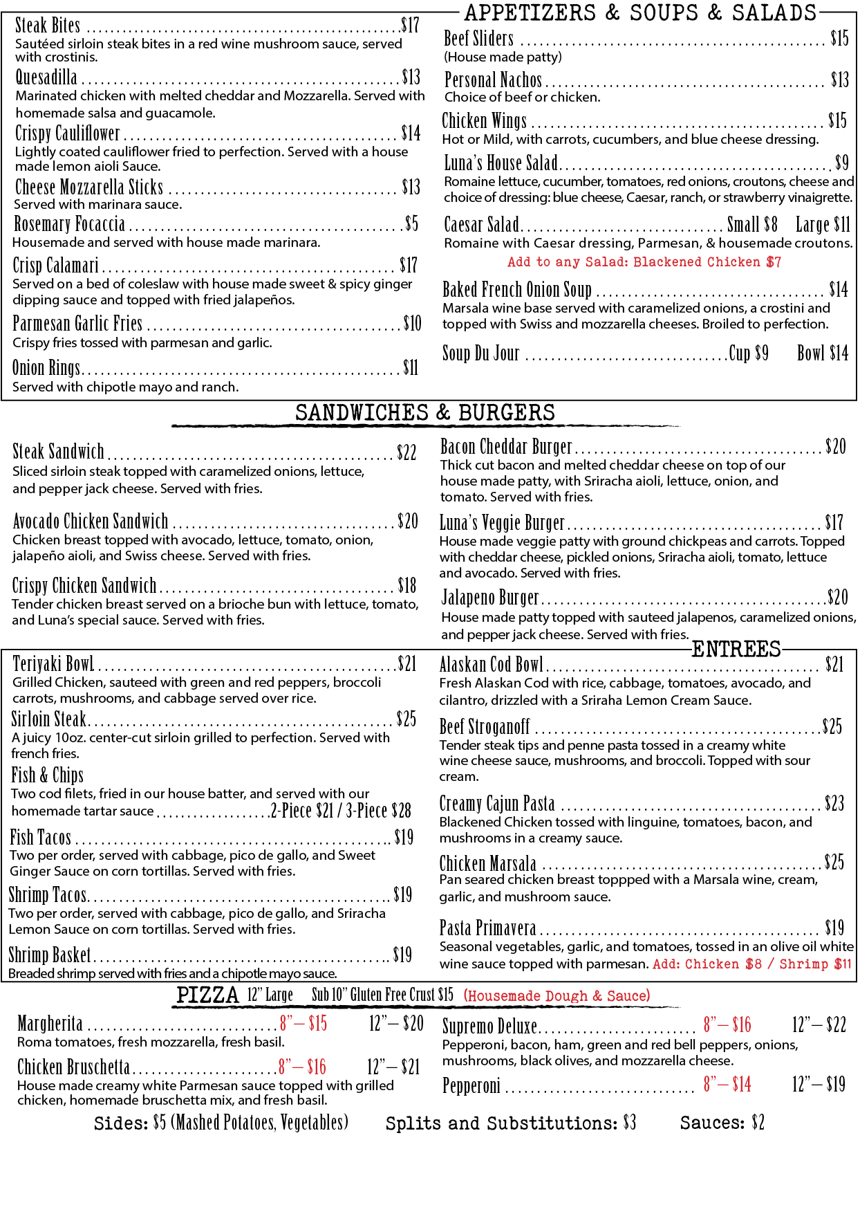 Come to Luna’s Bistro for some of the most sumptuous fare you’ve ever experienced. Luna’s Bistro offers a wonderful variety of original appetizers, home-made soups, fresh salads, sandwiches, satisfying entrees….we could go on and on. There is sure to be something for everybody. Just view our menu below and see for yourself!