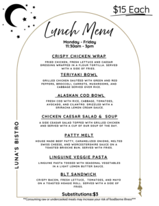 Hours and Menus may change from time to time. Please call us for our latest offerings and operating hours.